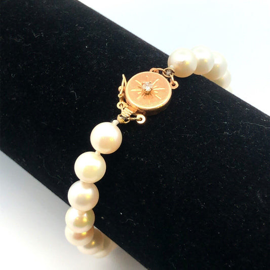 Vintage 14K Yellow Gold Diamond Accented Clasp 7.6 mm Pearl Bracelet