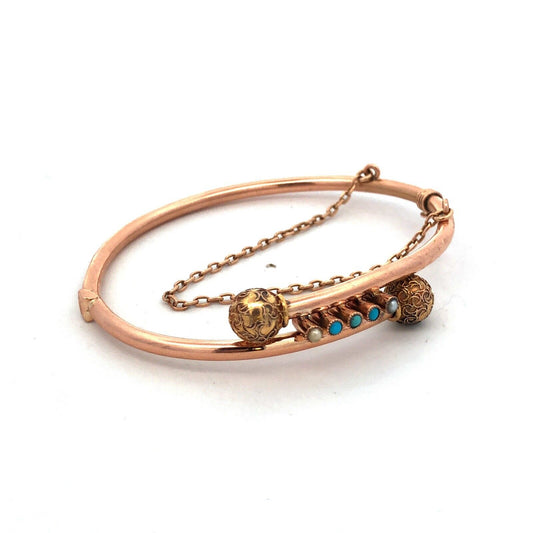 Vintage 10K Rose Gold Turquoise Pearl Textured Bypass Hinged Bangle Bracelet