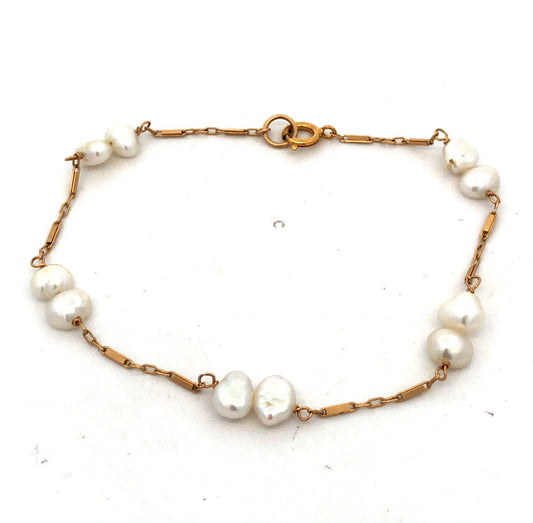 Estate 14K Yellow Gold White Pearl Beaded Station Bar Link Chain Bracelet