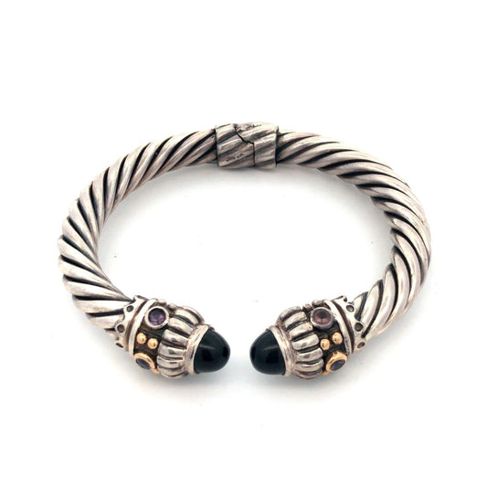 Designer 14K Gold 925 Sterling Silver Amethyst Black Onyx Cable Cuff Bracelet