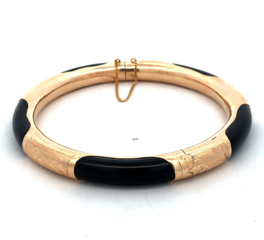 Vintage 14K Yellow Gold Black Onyx Engraved Round Hinged Bangle Bracelet
