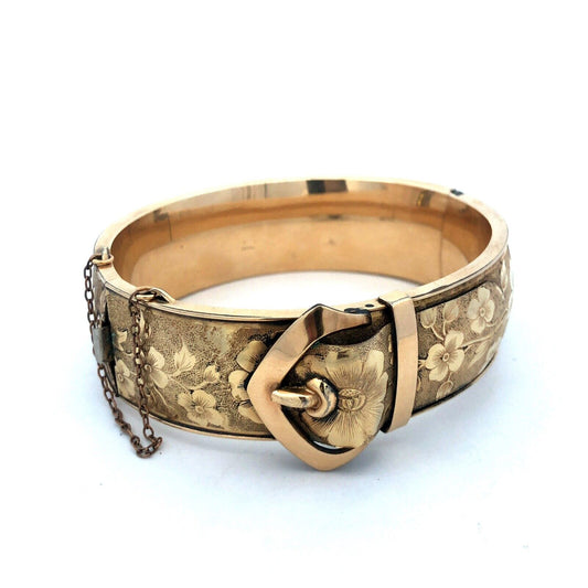 Antique F.M.Co 12K Yellow Gold Filled Floral Belt Buckle Hinged Bangle Bracelet