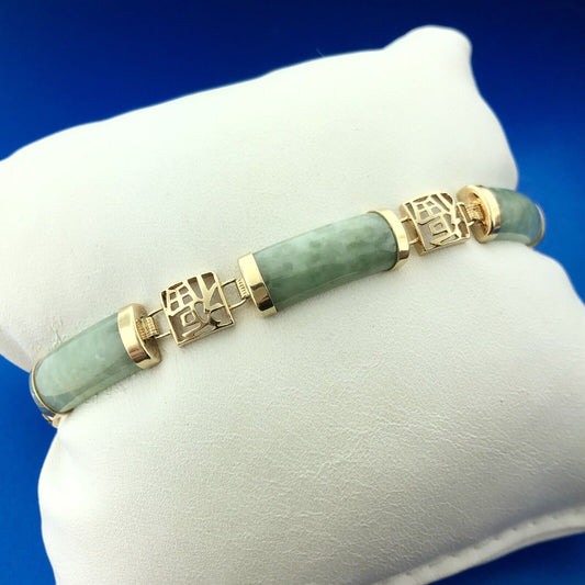 Retro 14K Yellow Gold Jade Jadeite Good Luck Character Statement Panel Bracelet