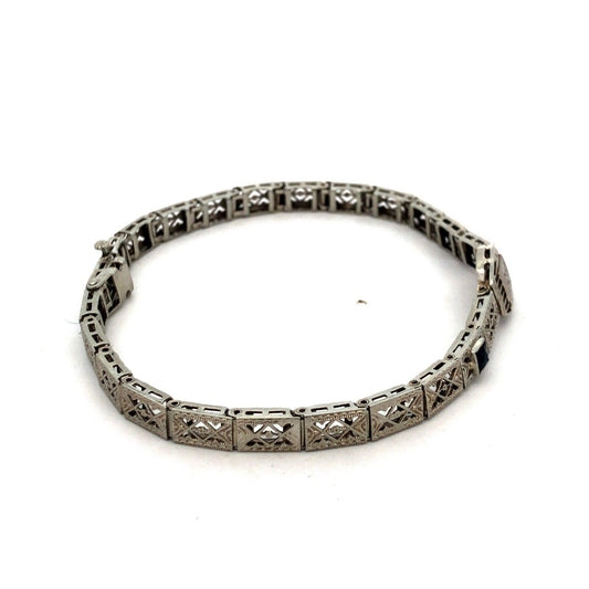 Vintage Art Deco 10K White Gold Diamond Sapphire Filigree Panel Tennis Bracelet