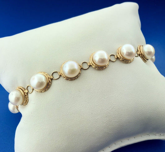 Vintage Elegant 14K Yellow Gold Pearl June Wedding Panel Link Bracelet