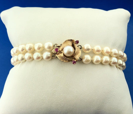 Vintage Elegant 14K Yellow Gold Ruby Pearl Double Strand Bridal Pearl Bracelet