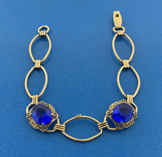 Art Deco AMCO Gold Filled Sterling Silver Faceted Blue Glass Oval Link Bracelet
