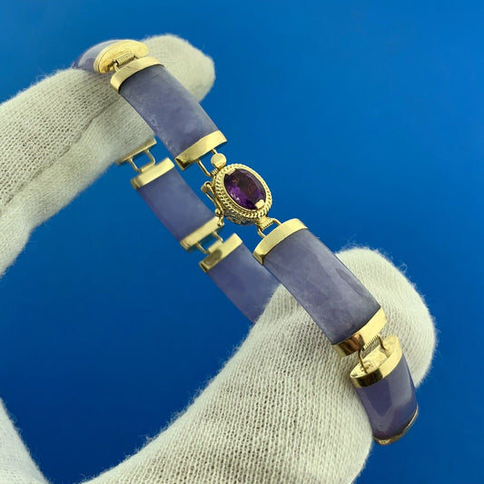 Designer 14K Yellow Gold Lavender Jade Bar Amethyst Statement Tennis Bracelet