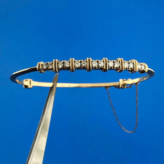 Vintage 14k Yellow Gold Round Cut Diamond Hinged Cuff w/Safety Chain Bracelet
