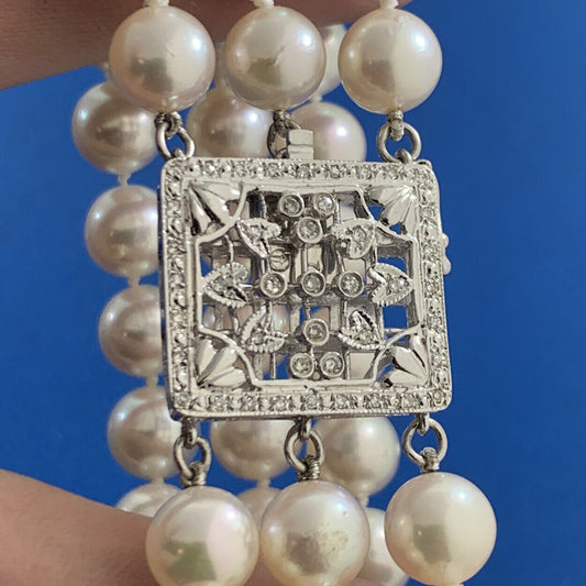 Designer 14K White Gold Pearl Diamond Three Strand Statement Wide Bracelet