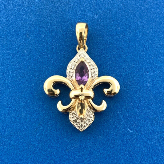 Designer 10K Yellow White Gold Amethyst Citrine Diamond Fleur De Lis Pendant