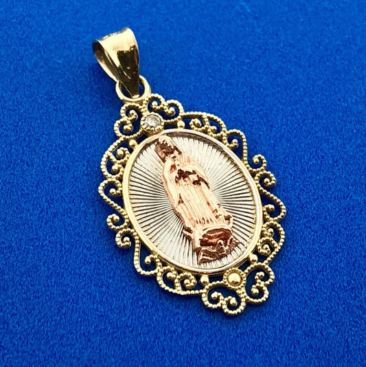 Vintage 10K Yellow White Rose Gold Diamond Oval Filigree Mother Mary Pendant