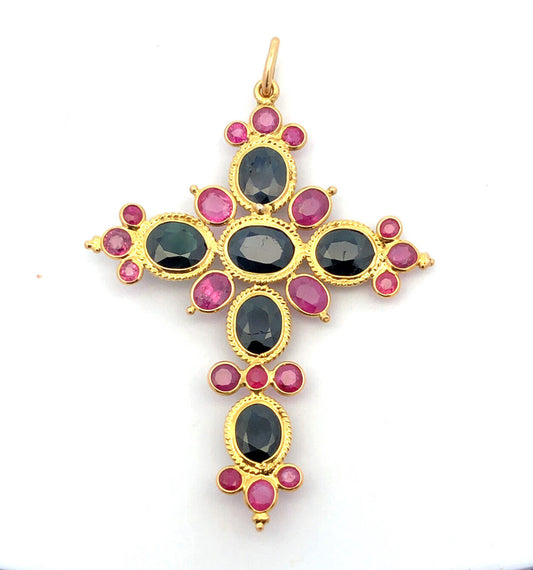 Estate 18K Yellow Gold Sapphire Ruby Statement Cross Religious Pendant