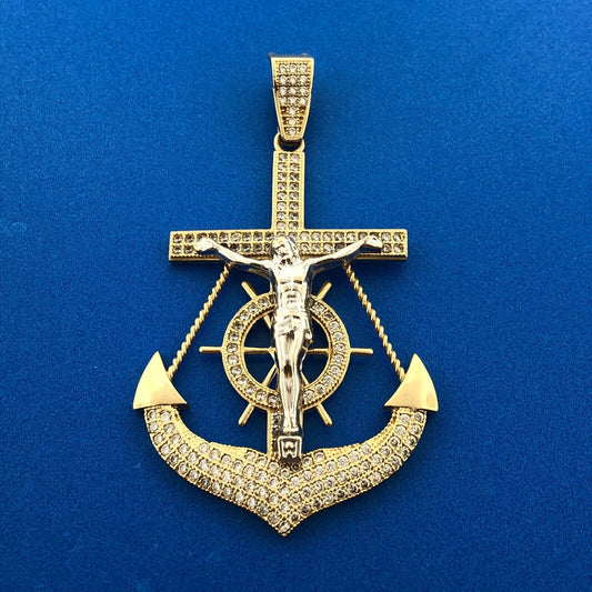 10K Yellow White Gold CZ Statement Sailors Cross Anchor Mariners Cross Pendant