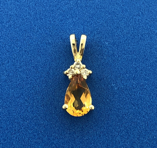 Gorgeous 14k Yellow Gold Pear Cut Citrine Round Cut Diamond Accent Pendant
