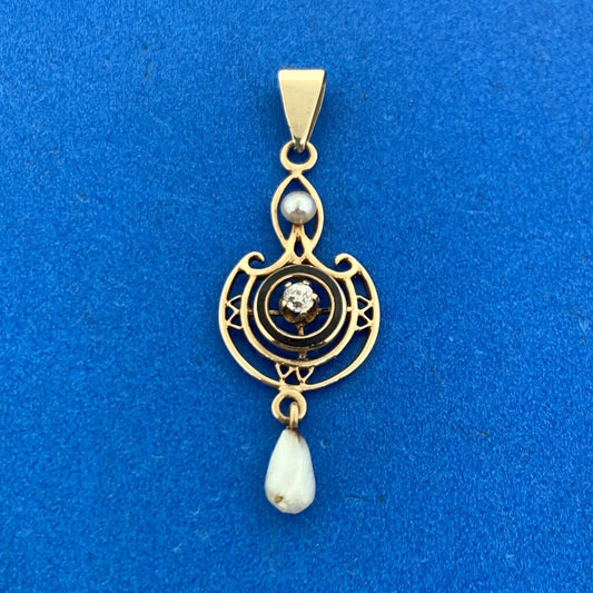 Art Nouveau 10K Yellow Gold Diamond Pearl Black Enamel Drop Dangle Pendant