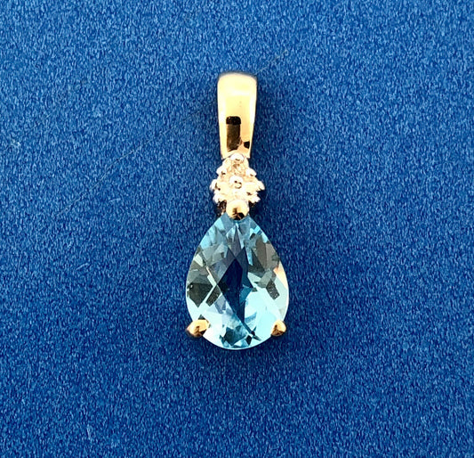 Estate 10k Yellow Gold Diamond Faceted Tear Drop Swiss Blue Topaz Pendant