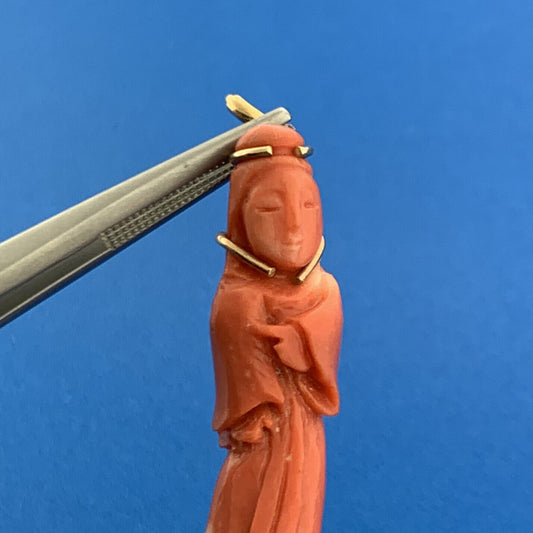 Gorgeous 14k Yellow Gold Carved Coral Chinese Eastern Wise Man Dangle Pendant