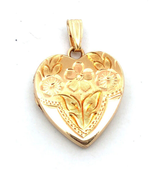 Designer HFB 14K Yellow Gold Floral Flower Engraved Heart Photo Locket Pendant