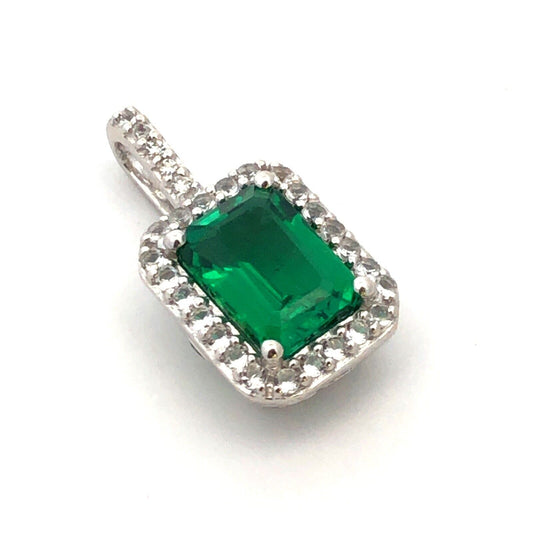 Designer A 10K White Gold Green Emerald Cut Emerald White Sapphire Halo Pendant