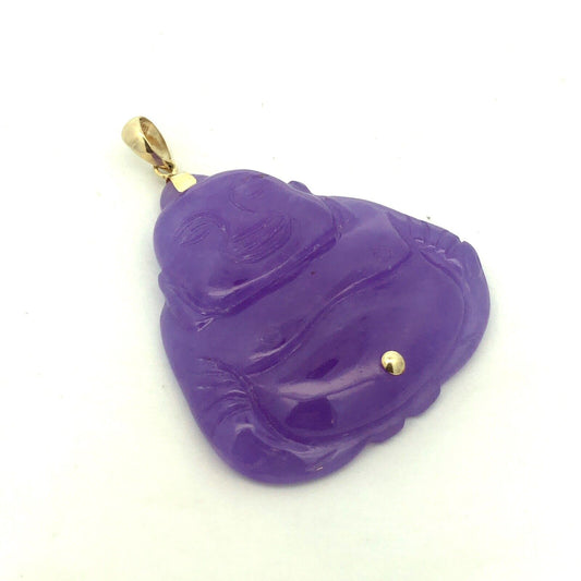 Vintage WW 14K Yellow Gold Carved Lavender Jade Buddha Statement Pendant
