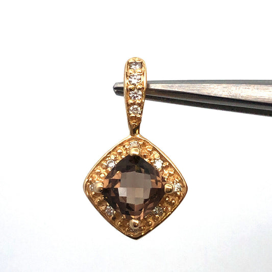 Designer 14K Yellow Gold Cushion Cut Smokey Quartz Diamond Accents Pendant