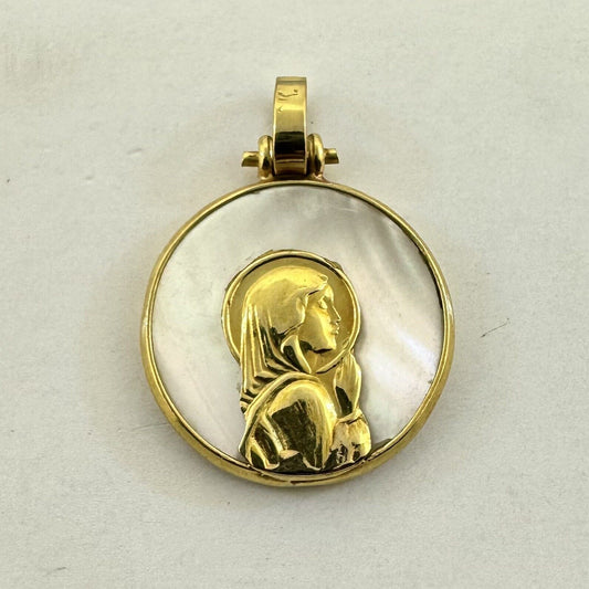 Vintage 14K Yellow Gold Mother Of Pearl Praying Girl Mary Round Pendant