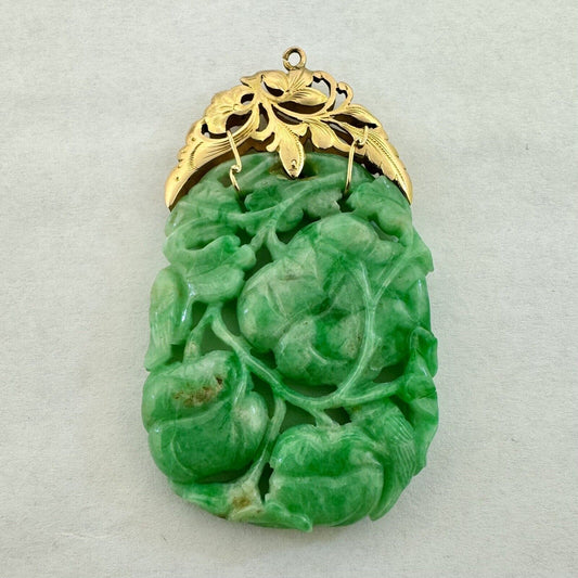 Vintage 14k Yellow Gold Oval Carved Green Jade Flowers Birds Statement Pendant