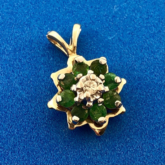 Estate 14K Yellow Gold Emerald Diamond Flower Cluster May Anniversary Pendant