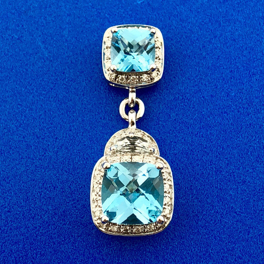 Stunning 14K White Gold Blue Topaz Diamond Aquamarine Accent Double Drop Pendant