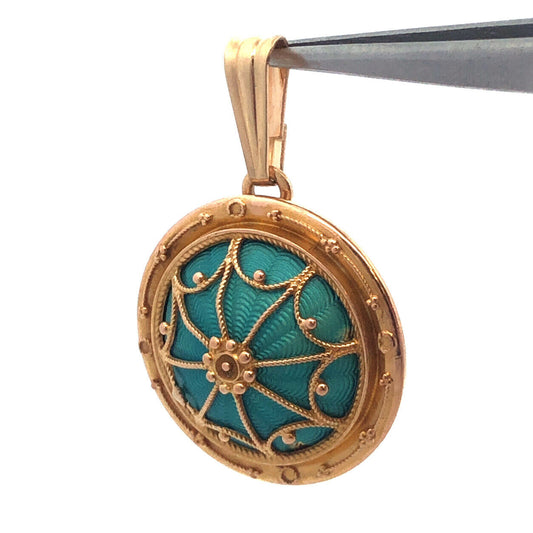 Art Nouveau Art Deco 14K Yellow Gold Aqua Turquoise Guilloche Enamel Pendant