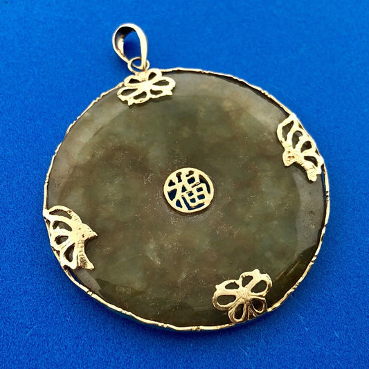 Vintage 14K Yellow Gold Jadeite Jade Chinese Character Good Luck Amulet Pendant