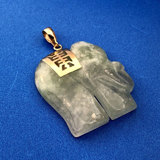 Vintage 14K Yellow Gold Carved Jade Jadeite Elephant Long Life Good Luck Pendant