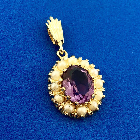 Victorian 14K Yellow Gold Amethyst Seed Pearl Halo February Anniversary Pendant