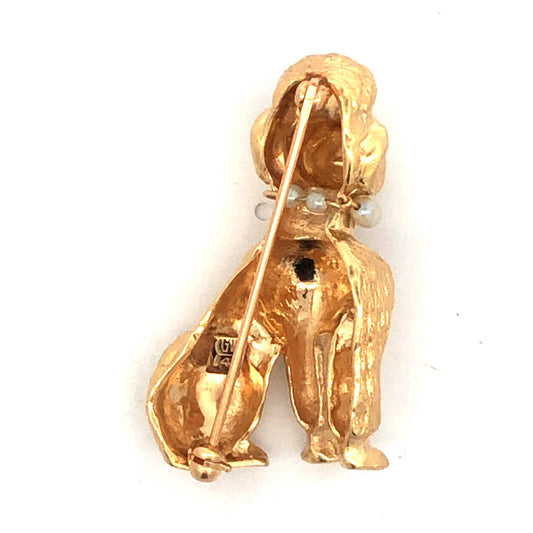 Vintage Designer 14K Yellow Gold Sapphire Seed Pearl Poodle Pin Pendant