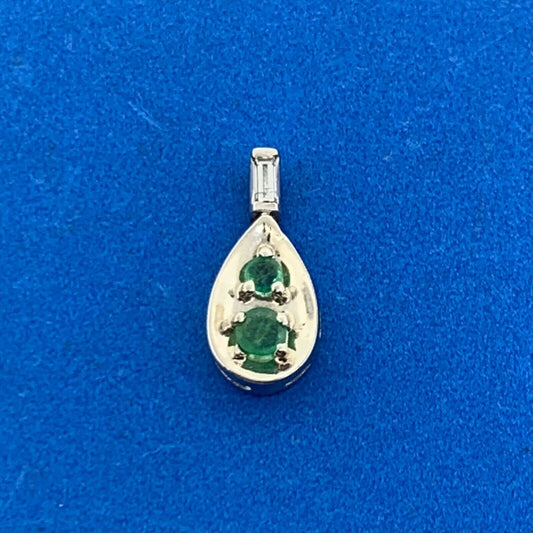 14K White Gold Emerald Diamond Baguette Accented Pear Shaped Pendant