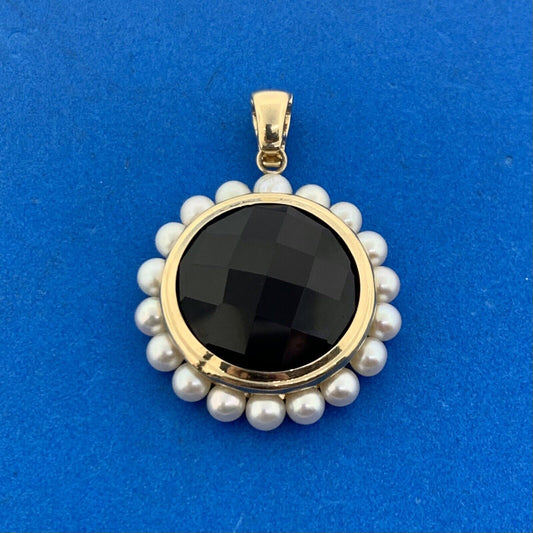 14K Yellow Gold Faceted Black Onyx Pearl Halo Statement Enhancer Pendant