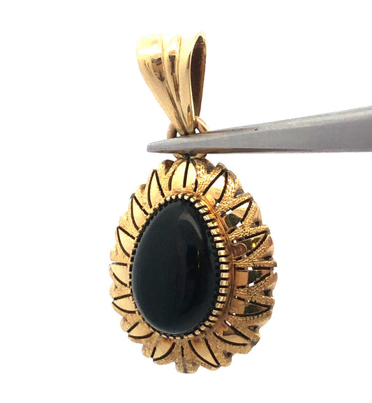 Vintage Mexico 14k Yellow Gold Black Onyx Pear Aztec Sunburst Drop Pendant