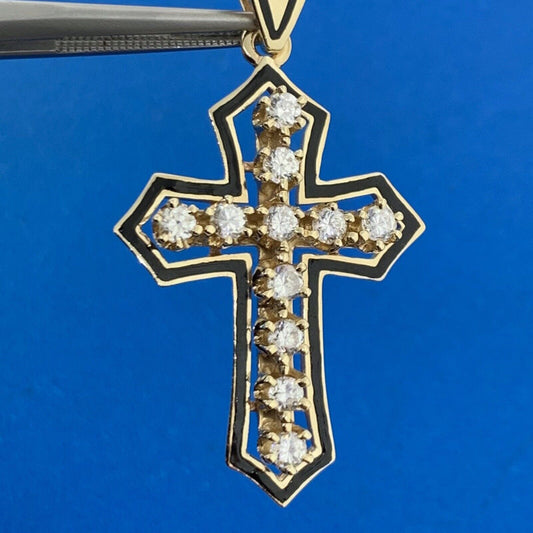 Designer 10K Yellow Gold Cubic Zirconia CZ Black Enamel Statement Cross Pendant