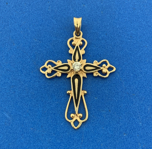 Retro 14K Yellow Gold Diamond Black Enamel Scroll Cross Religious Pendant