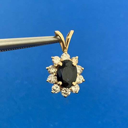 14K Yellow Gold Oval Blue Sapphire Diamond Halo Pendant