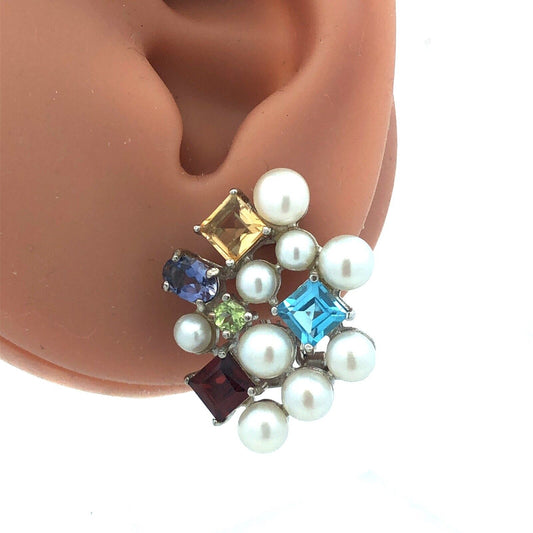 Ross Simons 925 Sterling Silver Pearl Multi Gemstone Cluster Stud Earrings