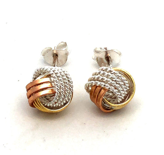 Designer 925 Sterling Silver Vermeil Tri-Tone Textured Twist Knot Stud Earrings