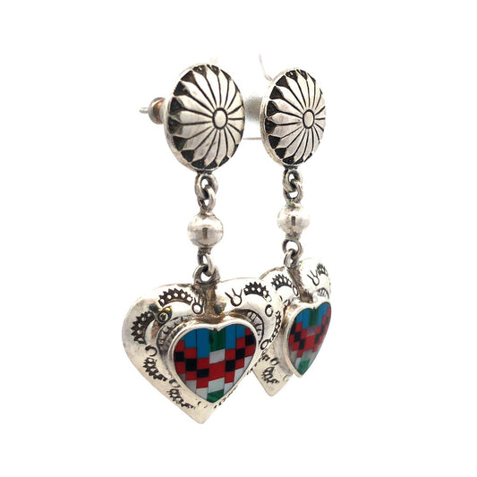 Native American Concho 925 Sterling Silver Multi Gemstone Heart Dangle Earrings