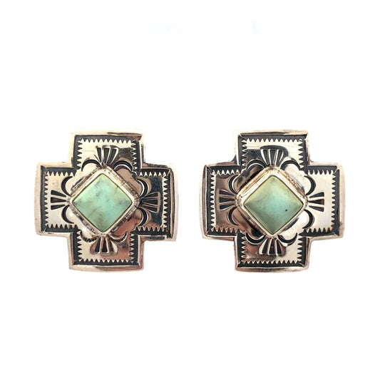Native American 925 Sterling Silver Green Turquoise Concho Cross Clip On Earring