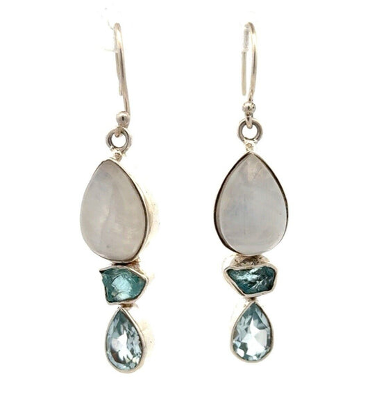 Vintage YS 925 Sterling Silver Moonstone Blue Topaz Tourmaline Dangle Earrings