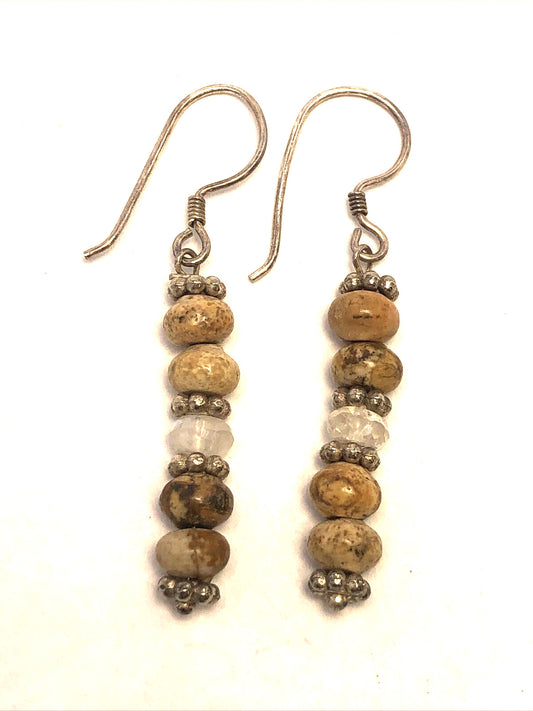 Sterling Silver 925 Moonstone Brown Jasper Beaded Natural Earthy Hook Earrings