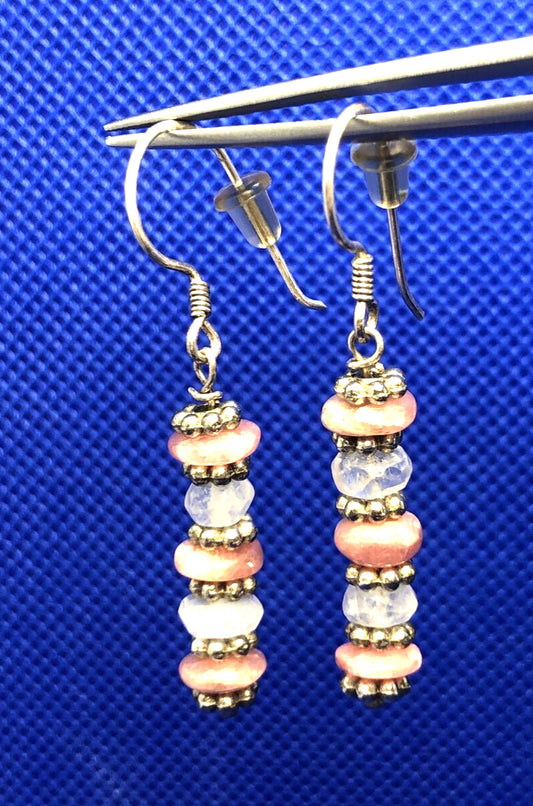 Sterling Silver 925 Pink Rhodochrosite and Moonstone Beaded Hook Dangle Earrings