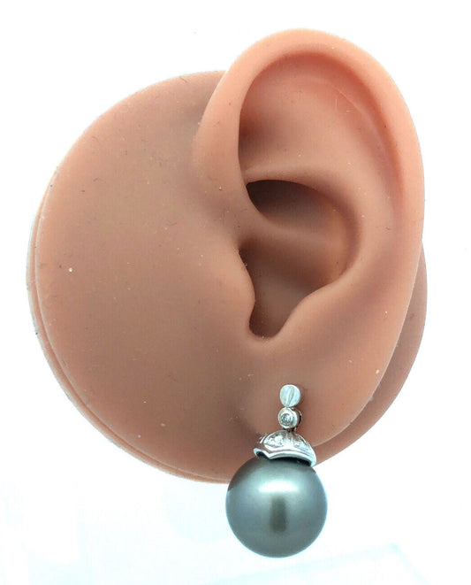 Gorgeous 14k White Gold Gray Pearl Round Cut Diamond Dangle Earrings 13.5mm