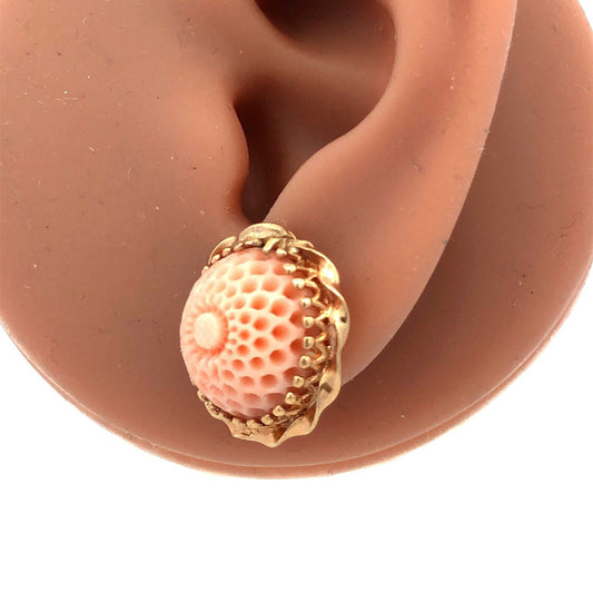Vintage 14K Yellow Gold Carved Textured Peach Pink Coral Dome Stud Earrings